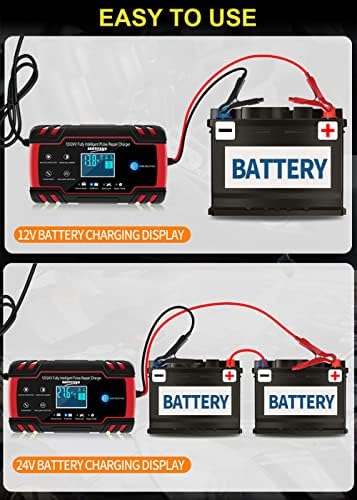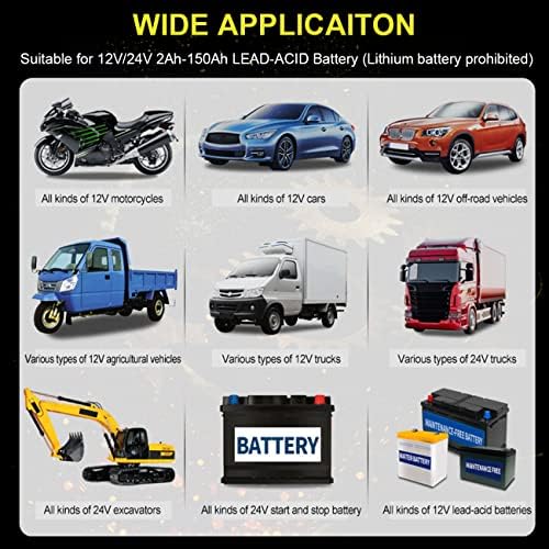 - Wide Application: 8 amp battery charger maintains and charges all type of 12V and 24V lead-acid battery from 6Ah-150Ah (12V), 6Ah-100Ah (24V), including AGM, GEL, Calcium, MF, SLA, VRLA, WET batteries. Perfect for charging and repairing cars, trucks, motorcycles, lawn mowers, boats, SUV, ATV, etc.