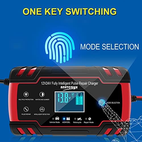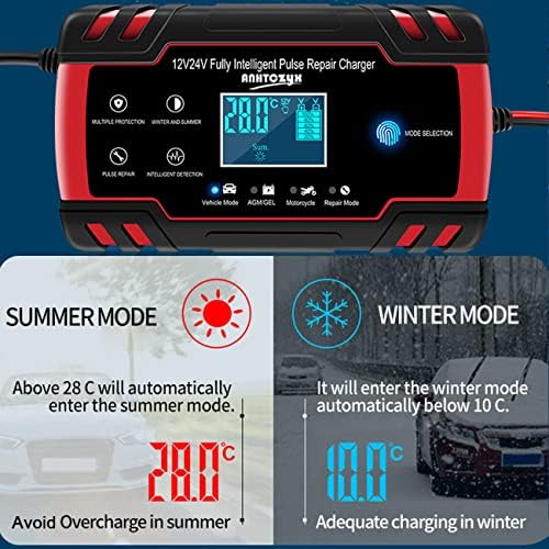 - 6 Charging Mode: The smart charger can automatically detect outside temperature, then auto-switch between SUMMER or WINTER mode and self-appropriate reduce or raise the charging voltage. CAR/TRUCK mode (12V 8A / 24 6A) for fast charging big batteries, MOTORCYCLE mode (max 1.5A) for small batteries, AGM mode for AGM, and calcium batteries, REPAIR MODE for repairing old batteries.
